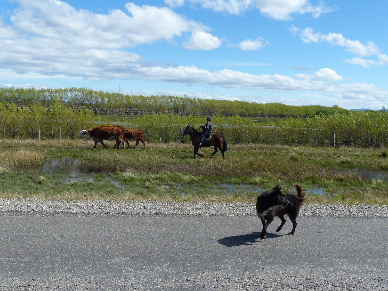 Puis, d’un coup, quelques dizaines de km avant d’arriver à Esquel, les paysages deviennent accidentés, verdissent un peu et nous retrouvons un peu de végétation. Nous voyons de nouveau de jolies estancias entourées de peupliers. La verdure redonne vie aux troupeaux de moutons et de vaches, ce que nous n’avions plus vu depuis des centaines de km. Les gauchos rassemblent leurs bêtes, fièrement montés sur les chevaux.